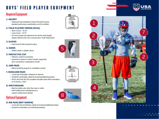 Players must be fully fitted with the proper gear as illustrated at the right and defined at USA Lacrosse.