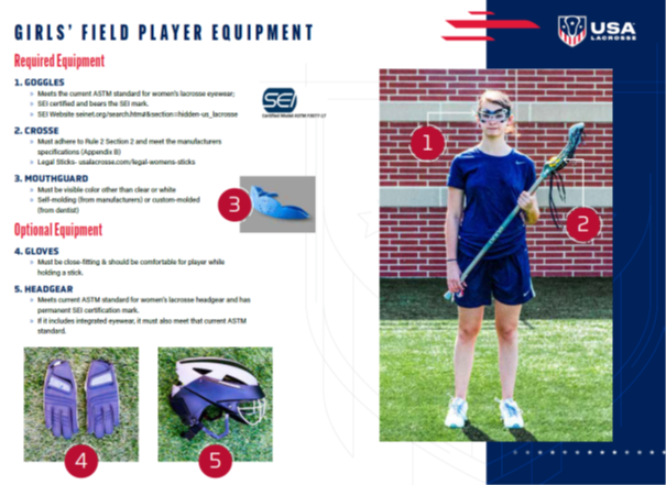 Players must be registered with USA Lacrosse prior to season registration. They must also be fully fitted with the proper gear as illustrated at the right and defined at USA Lacrosse.